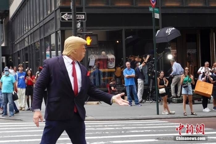資料圖:當地時間8月10日,一名戴著面具的示威者在美國紐約特朗普大廈外模仿美國前總統特朗普。近兩日,特朗普大廈前示威者、記者、圍觀民眾等人流聚集。 中新社記者 廖攀 攝